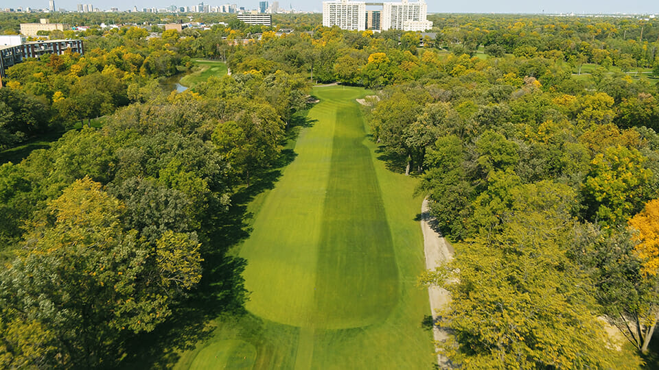 An extremely tight par 4 lined with trees along the left and right side of the fairway. The fairway slopes to the left, so you will need to favor the right side if you choose to hit driver. The green has two tiers and slopes heavily back to front. Make sure you take one extra club on the approach, as all shots short will end up rolling back down the hill.